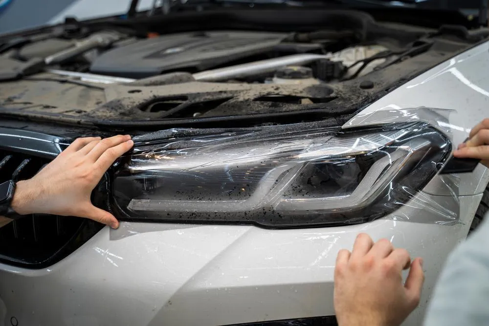 The headlights are first cleaned and prepped to remove any dirt or residue. A high-quality tint film is then carefully applied using heat and precision tools to contour perfectly around the headlight’s shape. Finally, the film is trimmed and sealed for a smooth, flawless finish.
